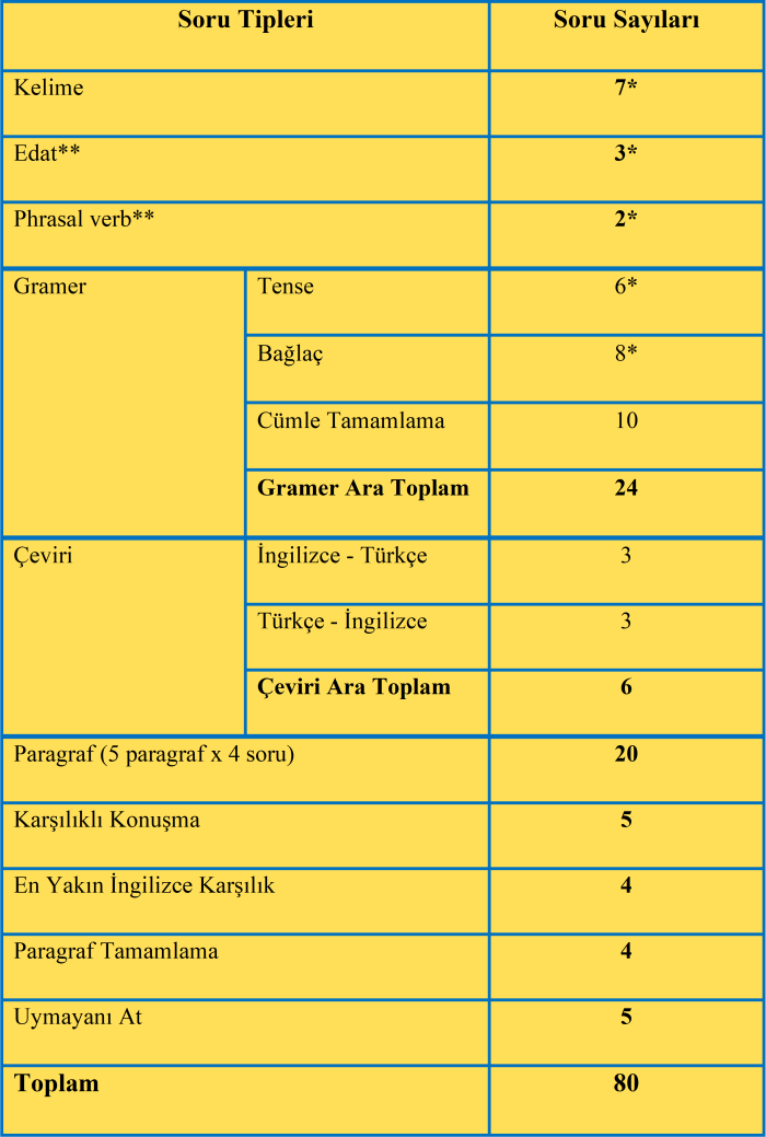 * işaretli soruların sayısı sınavdan sınava küçük değişiklikler gösterebilir. Örneğin, bir sınavda edat sorularının sayısı 3’ten 4’e çıkabilir. Phrasal verb sorularının sayısı ise 2’den 1’e inebilir.